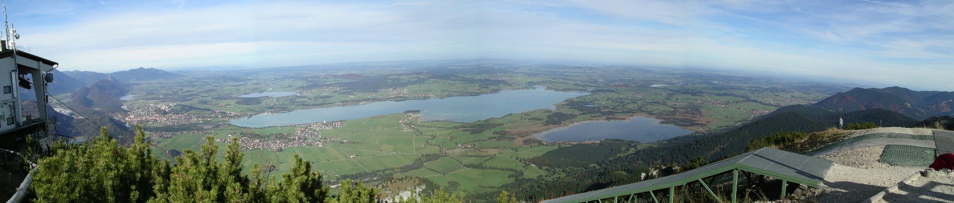 Rechts von der Seilbahnstation ist die Stadt Füssen zu erkennen, daran schließt sich der große Forgensee an.